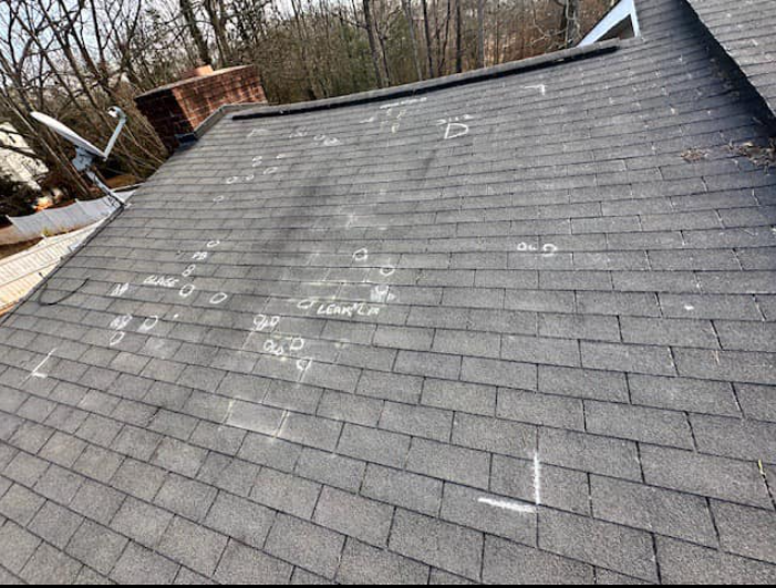 A test square marked with chalk makes the hail damage idenfication simple and undeniable. Prompt, efficient roof repair services to tackle leaks, cracks, and storm damage before they escalate.